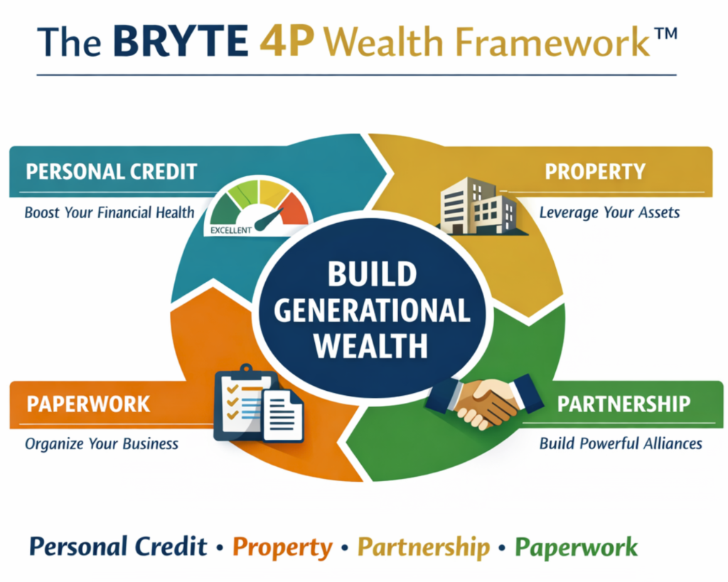 The Bryte 4P Wealth FrameworkTM is a practical roadmap to help individuals prepare for commercial property ownership and long-term wealth building. The framework focuses on four key areas—Personal Credit, Property, Partnership, and Paperwork—because ownership isn’t just about opportunity; it’s about being ready when the opportunity shows up.